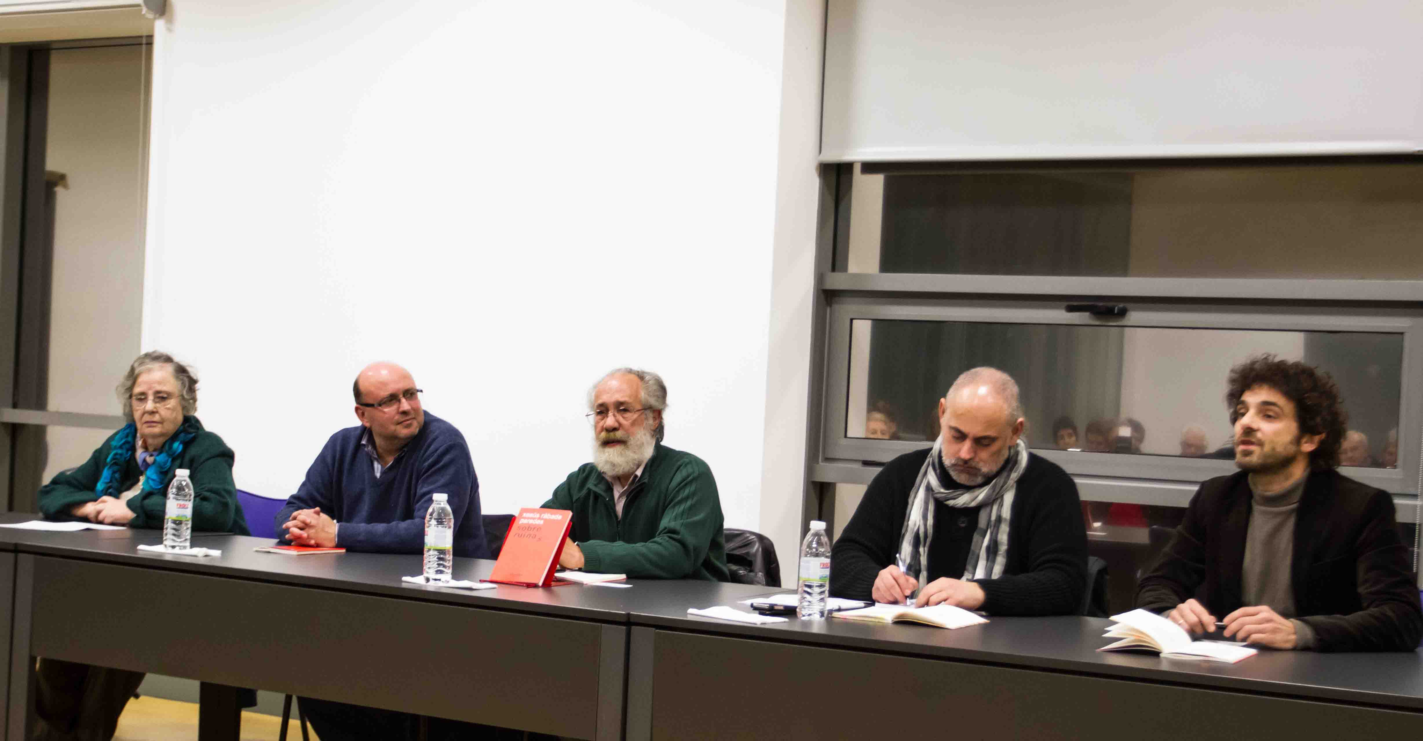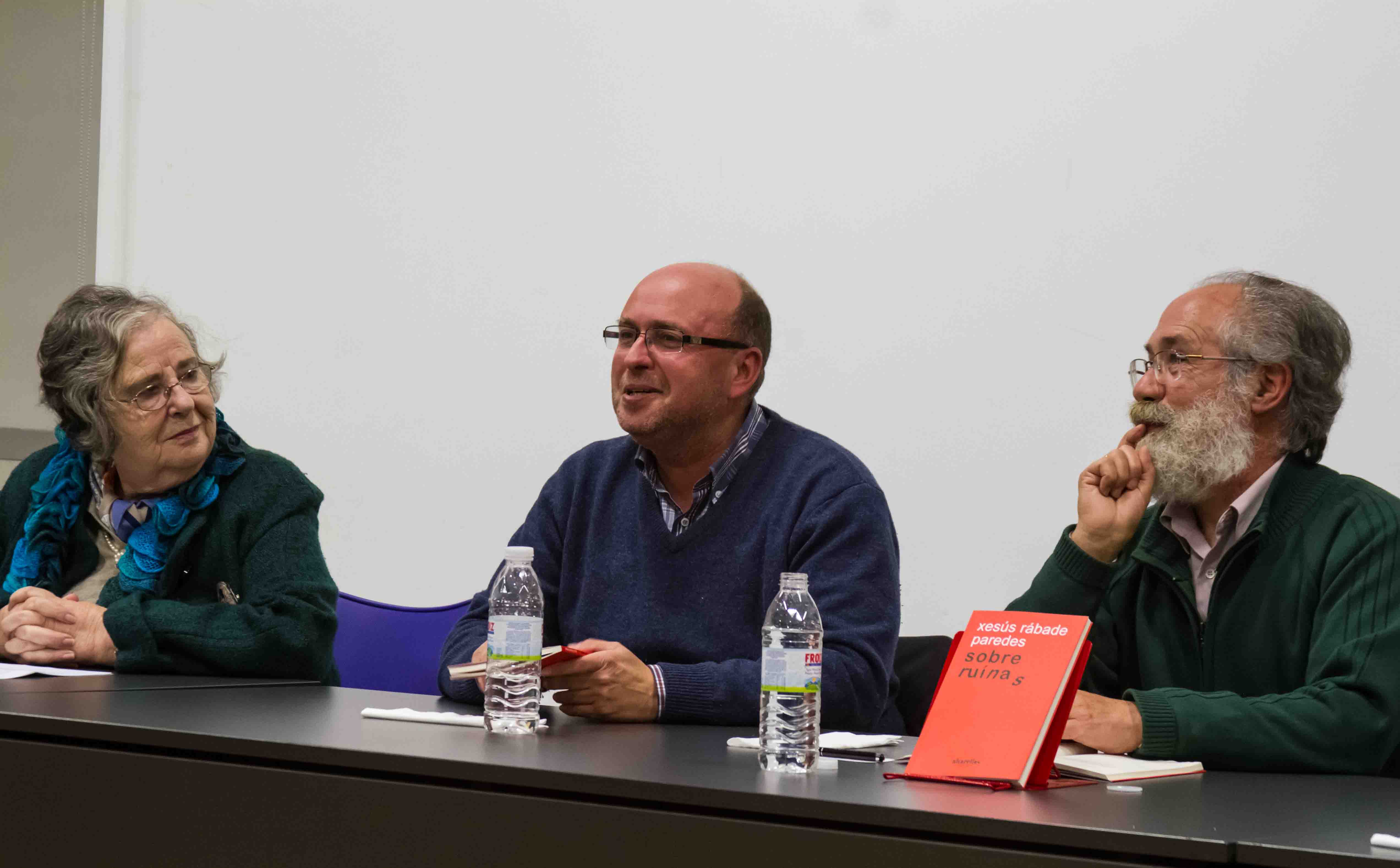 Cinco persoas estaban na mesa, incluíndo ao autor, as contribucións de Adolfo Muiños, Henrique Alvarellos, Fernando Lavandeira e Helena Villar Janeiro foron ben interesantes e acaídas. O primeiro deles, en calidade de alcalde e mantedor do acto, ademais da presentación e os agradecementos de rigor, fixo unha breve pero interesante aproximación de urxencia –pois urxente recoñeceu que foi a súa lectura– aos novos versos de Rábade, resaltando o seu carácter reivindicativo, socialmente comprometido, achegado ao país e ás súas eivas, pero tamén deixando un necesario oco á esperanza e á posibilidade de voltear o fanado presente que vivimos.