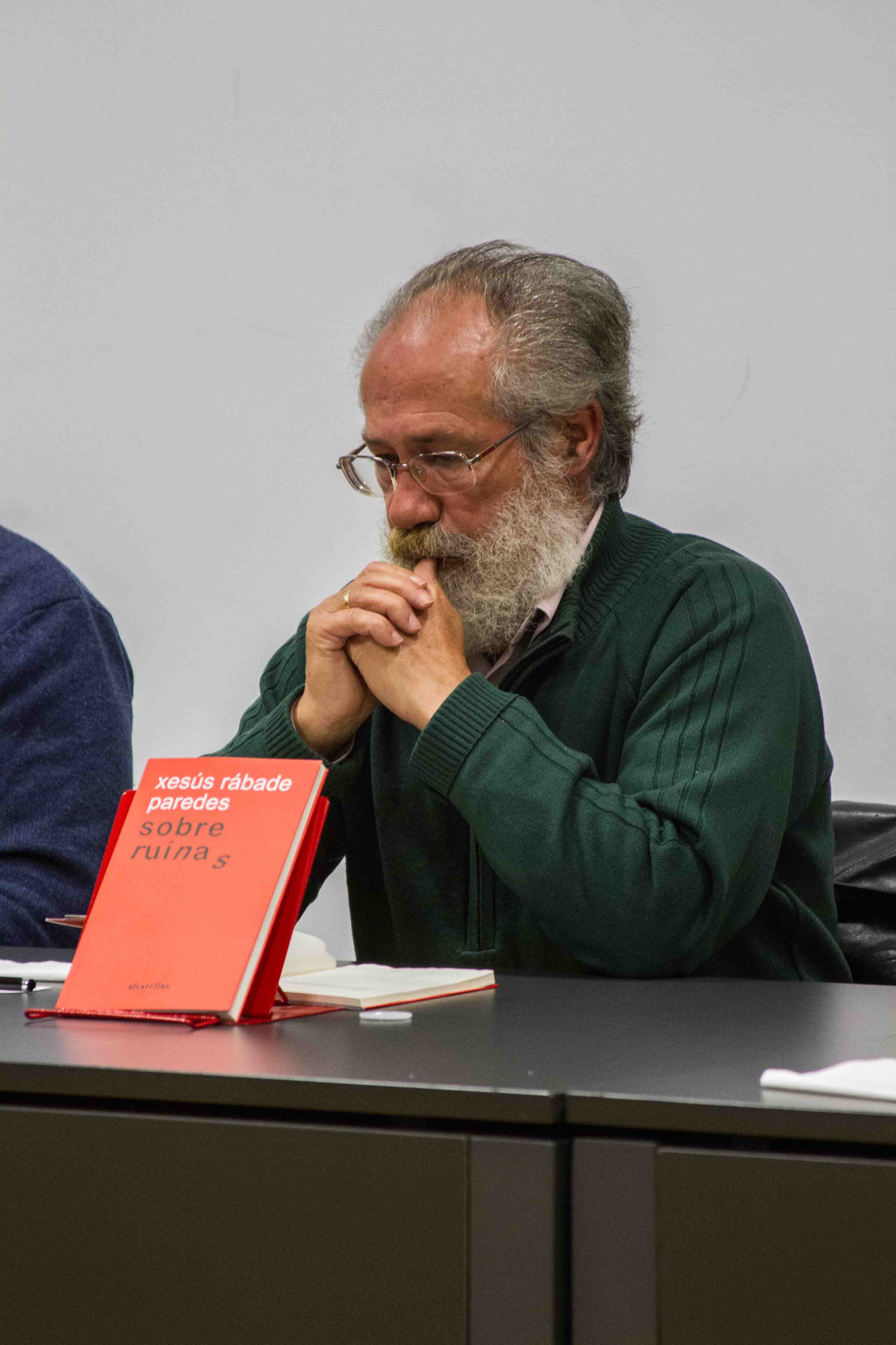 En definitiva, e como foi sinalado na mesa, unha obra de apenas sesenta poemas en cen páxinas que causa fascinación e alivio. Fascinación, porque fascinante e intensa –ademais de moi próxima– é a poesía de Xesús Rábade Paredes en xeral e a deste libro en particular, que se sitúa, seguindo a periodización temática que o propio autor fai de si mesmo, nese momento de nostalxia e certa melancolía que emerxe dos anos transcorridos. Sen embargo, máis alá desa señardade, e mesmo do amor e da reivindicación social –as outras grandes temáticas que recoñece propias e que tamén están presentes nesta obra–, Sobre ruínas está recorrido por una vaga axitadora, mesmo iracunda, que pretende bater con toda a violencia da palabra contra a nosa conciencia anestesiada e adormecida entre telelixo prime time e claudicación inducida a golpe de telexornal, periódicos e primas de risco. Neste aspecto –e velaí está o alivio– si é unha obra necesaria, esperada e agardemos que inaugural desa trincheira na que os centos de poetas e intelectuais que, disque, hai neste país, xa deberían estar batallando ao par de Rábade contra a gadaña certeira do neoliberalismo predador que nos impoñen.