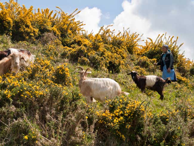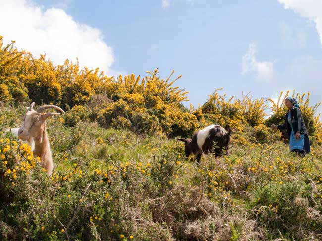 Pregúntolle se lle podo facer unhas fotos coas cabras e dime que si, sen problema. Mentres me achego, dime que espere, que vai xuntar os animais e o can levántase amosándome os dentes. De súpeto, as cabras vanse metendo por unhas corredoiros no medio de toxos de metro e medio de altura e María vai tras elas.
