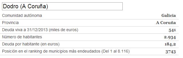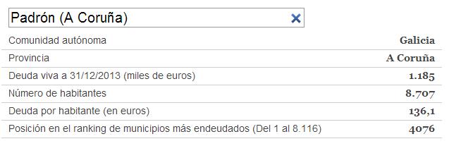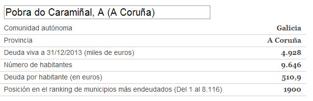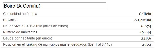 Grazas a un amigo meu, a Tato, descubrín unha aplicación moi interesante do xornal Cinco Días que permite coñecer a débeda de cada un dos concellos españois. Incluso é posible descargar un documento en pdf con todos os datos.