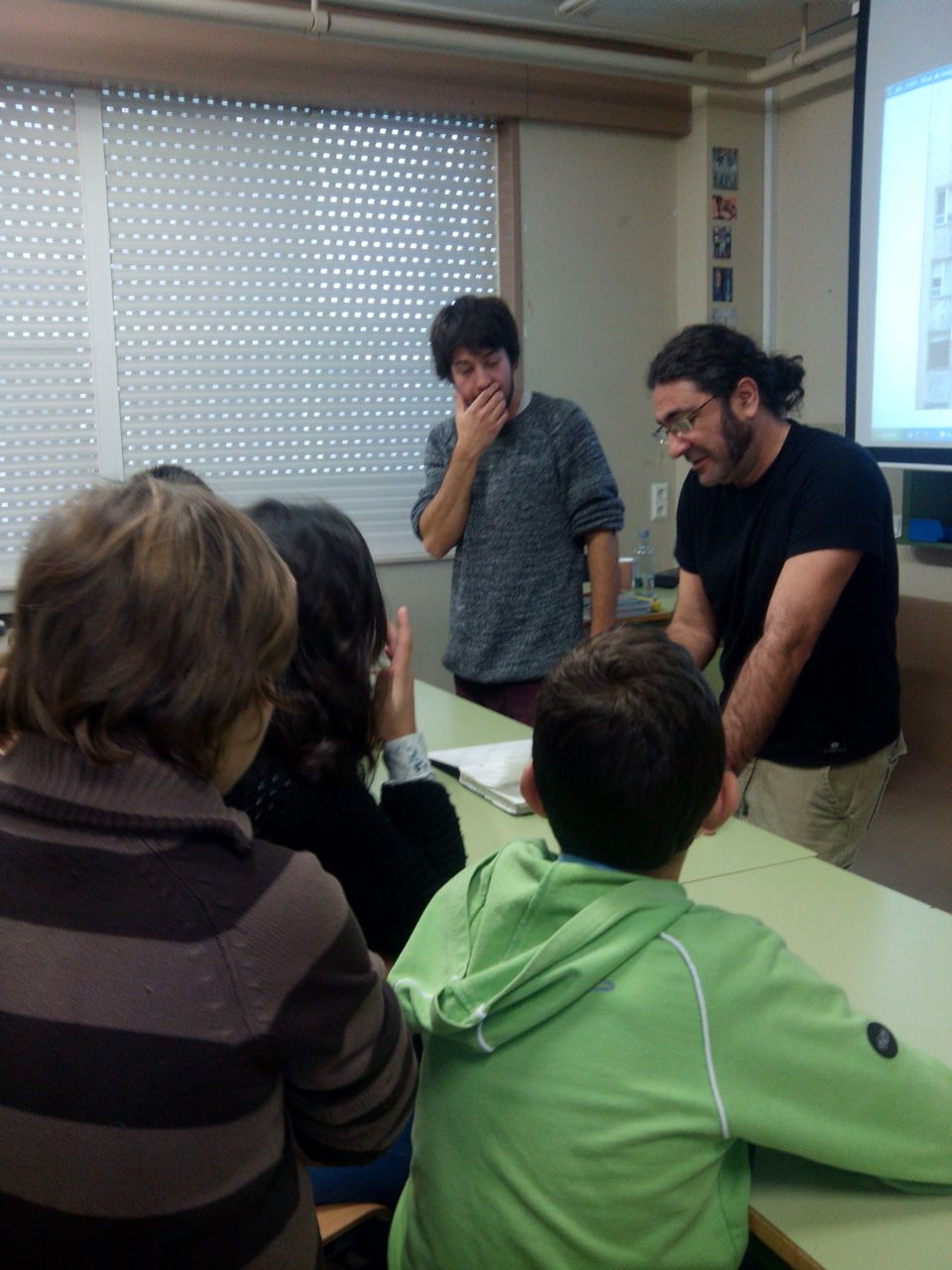 Dos 31 creadores do libro, polas aulas do instituto de Rianxo pasaron 12, que puideron interactuar cos rapaces. E xa vedes, en fotos como a de arriba, que tamén demostraron o seu talento.