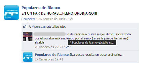 O afán do BNG pola alcaldía levouno a facer un pacto, que si é o que se di a prensa, nos deixa como estabamos. É a mesma escoba pero con diferente pau… E dicir, o Sr. Muíños dedicouse a criticar as contas do Concello durante 4 anos e á persoa que as levaba, e agora dálle esa concellalía a el. E por parte do PSOE, que vou dicir… dous días despois do resultado das eleccións din nos medios de comunicación que eles van a estar onde os puxo o pobo, que é na oposición, e agora desdinse a cambio do poder. Xogaron con Rianxo e cos rianxeiros. O BNG fai unha lectura errónea das eleccións dicindo que Rianxo votou a esquerda claramente, iso é relativamente certo pero porque en Rianxo se presentaron dous partidos de esquerdas e un de dereitas. Esa lectura só se pode facer se se presentasen o mesmo número de partidos coa mesma ideoloxía. Está demostrado que en Rianxo van a gobernar os perdedores, porque así o reflectiron as urnas.